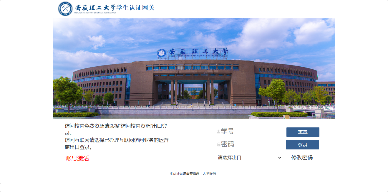 3.学生用户请连接AUST_Student,使用浏览器打开任意网址,自动跳转至网络认证页面(http://door.aust.edu.cn),输入正确的学号与密码(账号密码问题办事大厅_业务介绍 (aust.edu.cn)),再选择已办理互联网访问业务的运营商的出口登录网络,点击登录按钮,即可访问相应的网络资源,如图1-4: