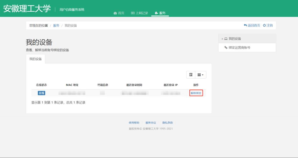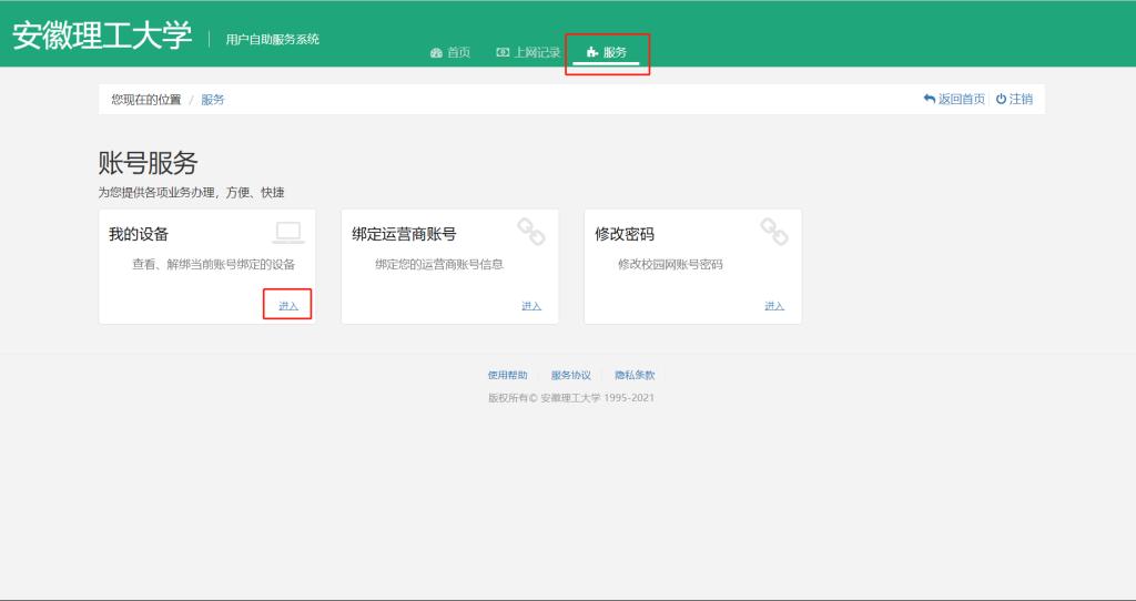 当用户绑定的终端数目超出3台时,再次认证登录时系统会提示“只能在限定的MAC地址登录”;或者需要解除某个终端绑定操作时,操作如下,用户登录自助服务页面,点击下图红框中的“服务”,再点击我的设备中的“进入”,最后点击“解绑”即可,如图2-2和图2-3: