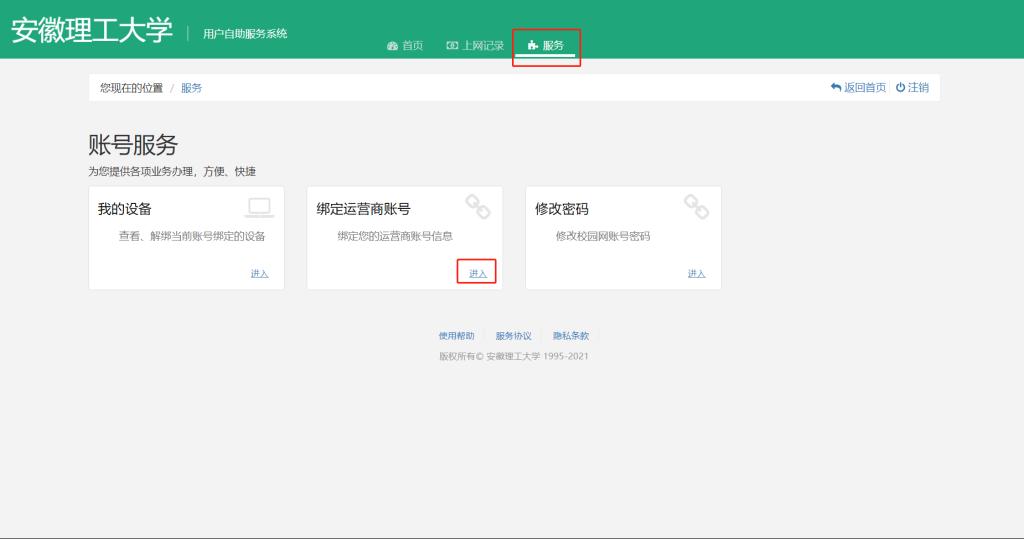 用户登录自助服务页面,点击下图红框中的“服务”,再点击绑定运营商中“进入”,如图3-1。