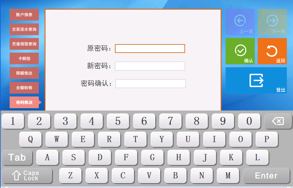点击系统桌面的“电控转账”,进入相应功能界面,参照上图。