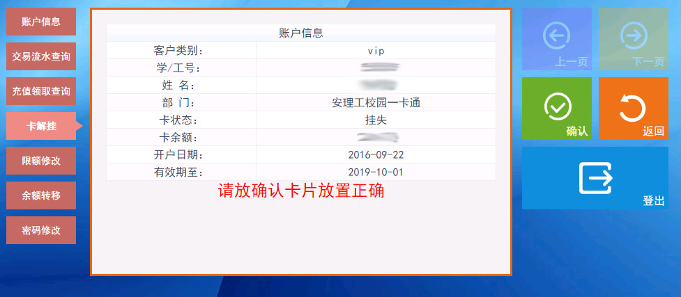 点击“校园卡务”后,可进行校园卡业务的操作,界面如下: