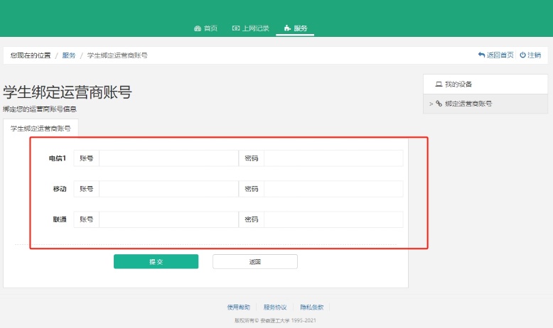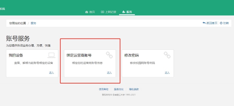 同学们如需访问互联网资源请至运营商处开户,开户后还需登陆用户自主服务系统进行运营商账户绑定操作: