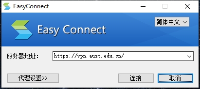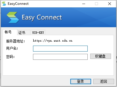 打开EasyConnect软件后在服务器地址栏输入学校VPN访问地址:https://vpn.aust.edu.cn点击连接,在登陆页面输入账号密码后点击登录即可。(VPN密码为个人统一身份认证账号密码)
