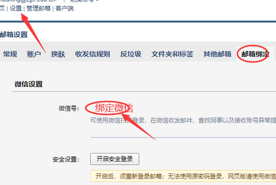 · 登录邮箱,选择【设置】—【微信绑定】。