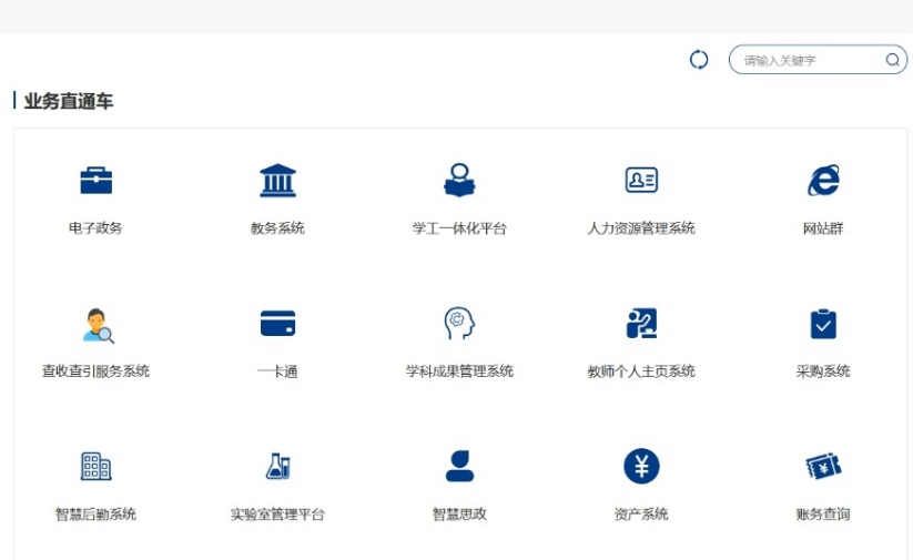 目前网上综合服务大厅已完成与电子政务、教务系统、一卡通等系统的对接,在登录服务大厅后可在业务直通车栏目下直接点击需要访问的应用系统即可直接跳转至相应系统的首页。